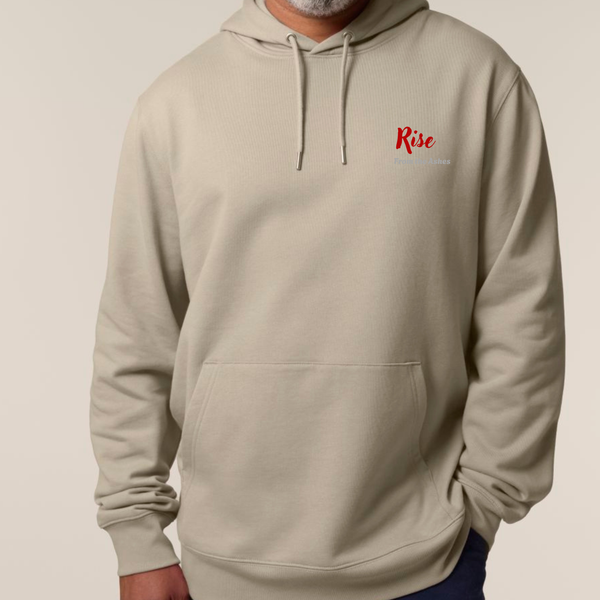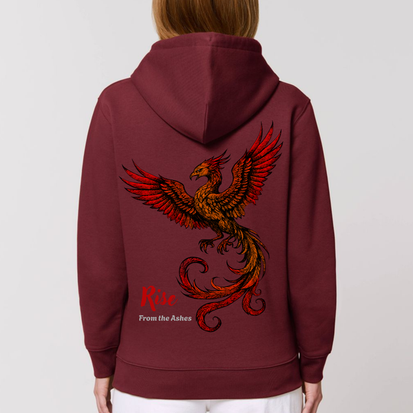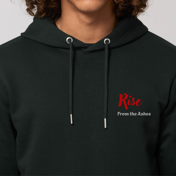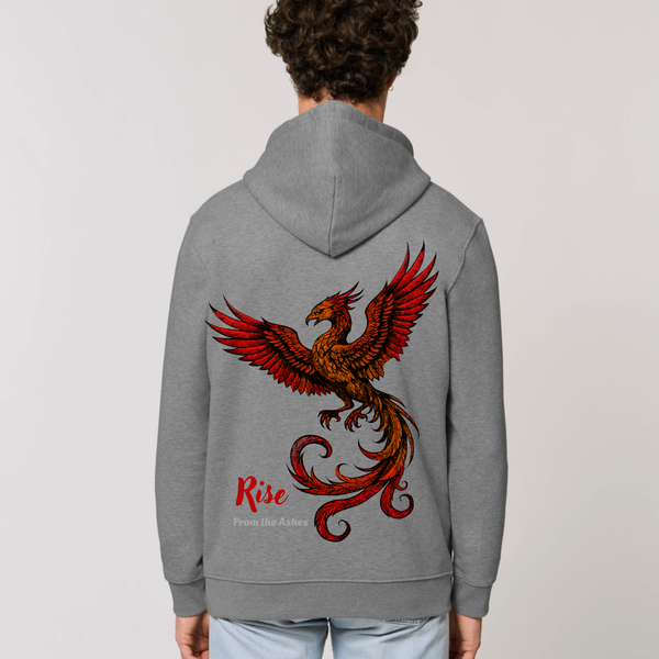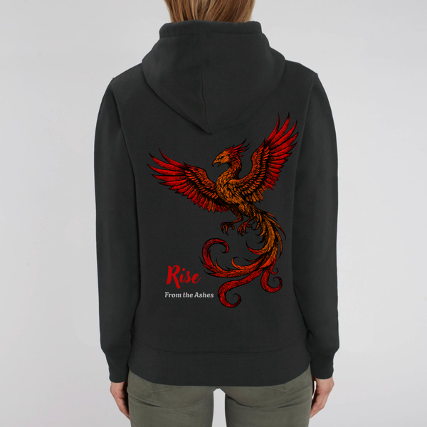The Rise hoodie features a striking back print of a phoenix. This symbolises rebirth and the strength it takes to get up again even when it feels like you are being beaten down.