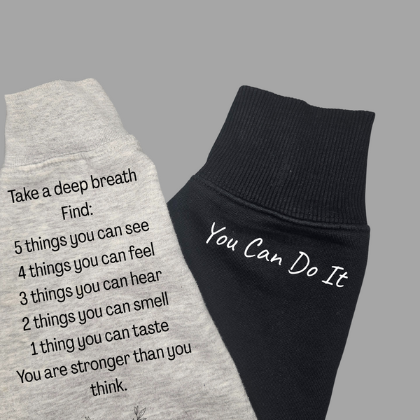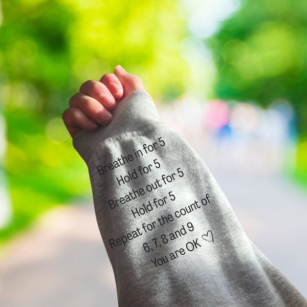 These hoodies have been designed specifically with Grounding methods on the sleeves. These can aid in preventing anxiety or spiralling thoughts.